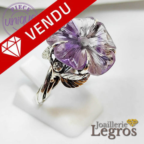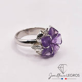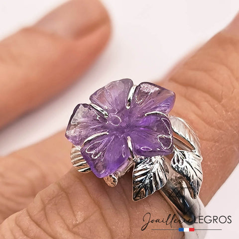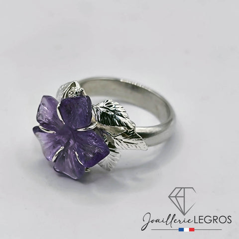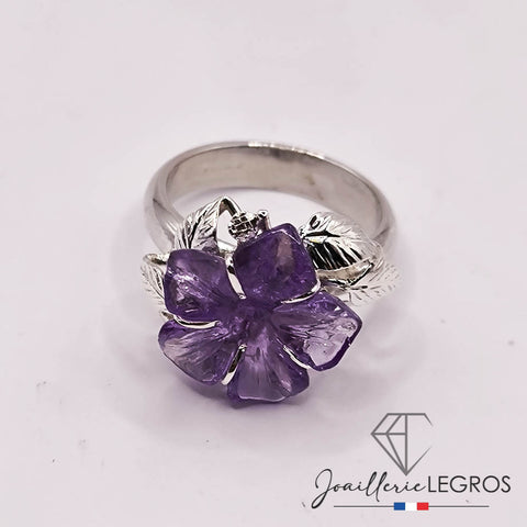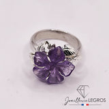 Laissez-vous séduire par la beauté délicate de cette bague artisanale en argent massif, ornée d’une fleur sculptée en véritable améthyste.