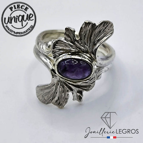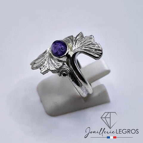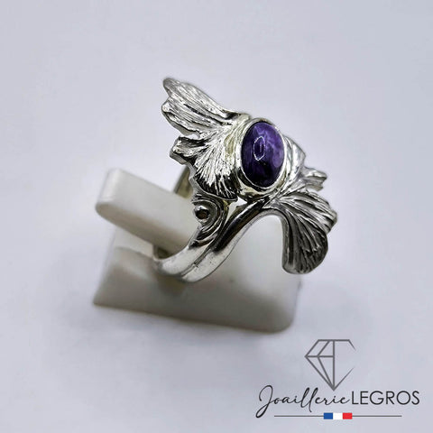 Cette bague Gingko en argent 925 est une création artisanale unique, façonnée à la main dans notre atelier. Le design s’inspire de la feuille du ginkgo biloba, symbole de longévité et de résilience, qui enlace avec élégance une charoïte naturelle ovale de 1,34 carat (8×5 mm). Ses reflets violets hypnotiques apportent une touche de mystère et de douceur à cette pièce d’exception.
