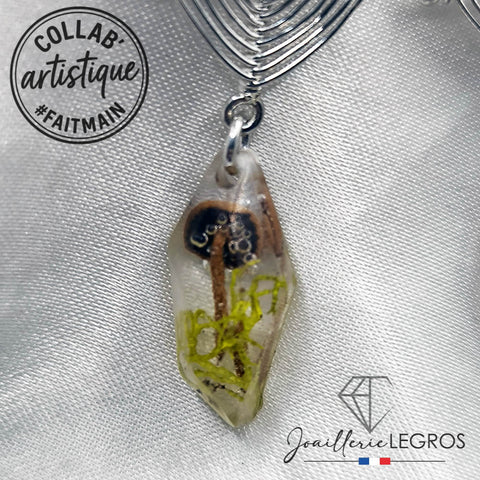 Véritables bijoux bohèmes, elles associent la finesse d’une monture en argent 925 au charme naturel d’inclusions végétales. Chaque pendentif renferme un mini champignon accompagné de mousse et de lichen, figés dans une résine époxy transparente, telle un petit terrarium miniature.