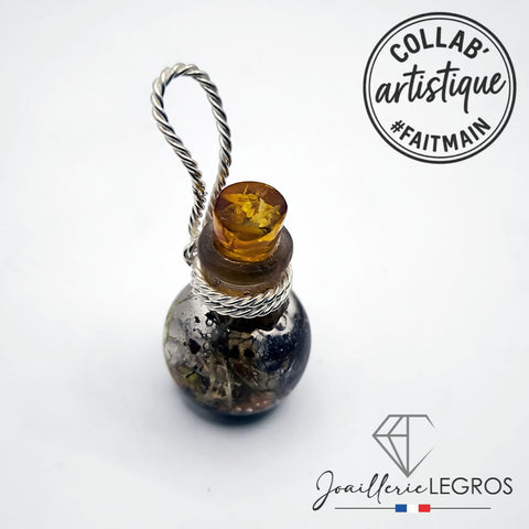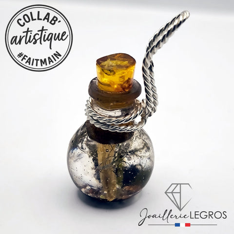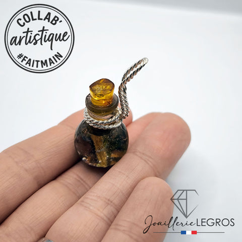 Pendentif Fiole avec champignon bouchon d'ambre Résine et Argent 925